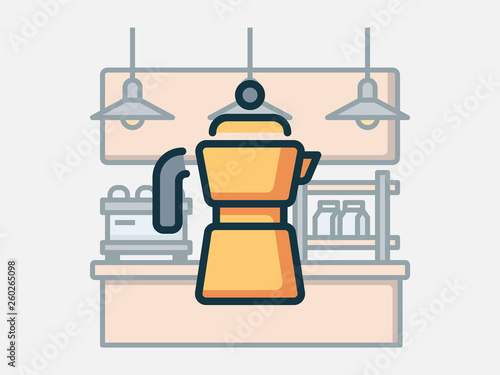 Coffee production vector flat illustration. Turkish cezve pot, grinder, cup of hot drink, kettle, hand holding cinnamon bottle. Healthy cinnamon spiced coffee poster, banner.