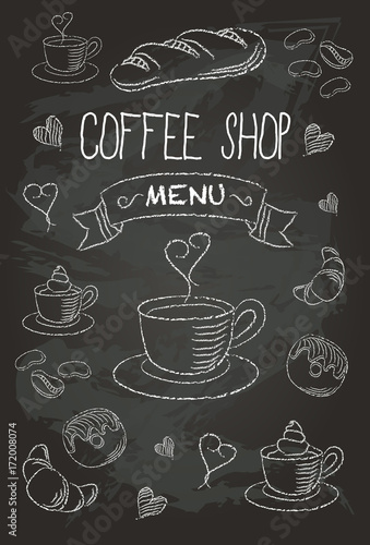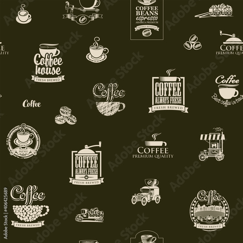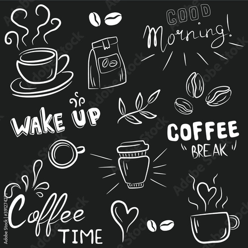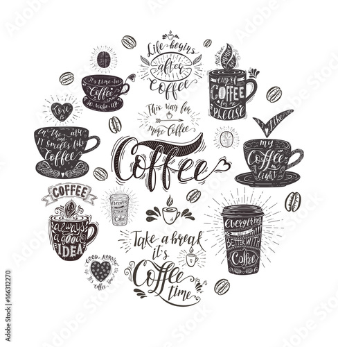 Coffee quotes hand lettering typography, vector illustration. Coffee mugs with motivational morning coffee sayings. Vintage labels, emblems with inspirational phrases on black background.