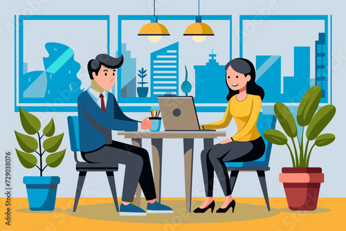 Coffee shop scene. Happy man and woman drinking coffee, talking to each other sitting at bar counter, flat vector illustration. Young people friends meeting. Coffeehouse, cafe interior.