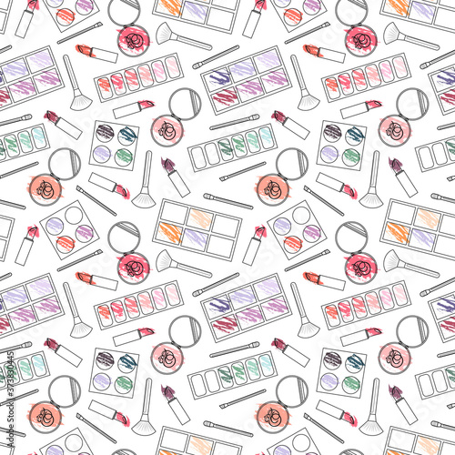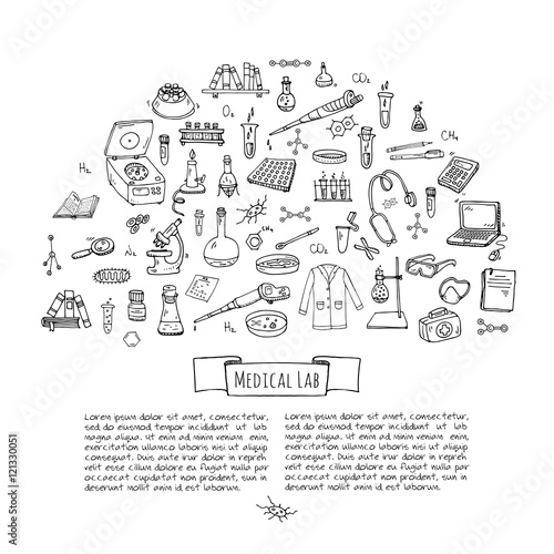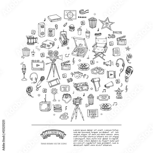 Realistic top view cup of coffee against hand drawn business and finance symbols background, vector illustration. Coffee time poster design template.