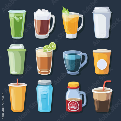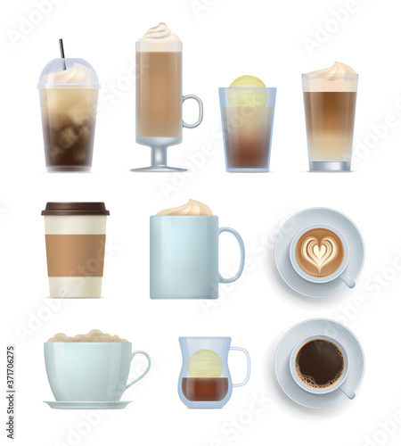Coffee types set, vector isolated illustration. Espresso types, doppio, trippio, cappuccino, frappe, americano, caramel macchiato, other coffee drinks with names for restaurant, cafe menu etc.