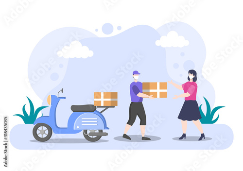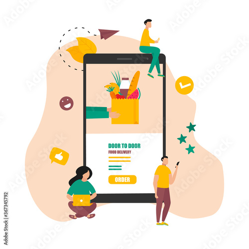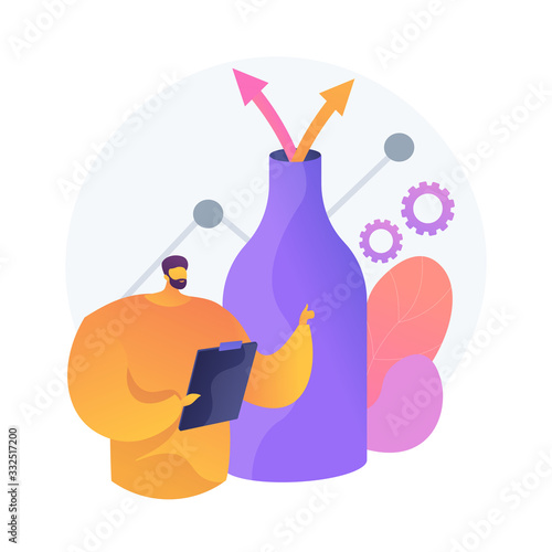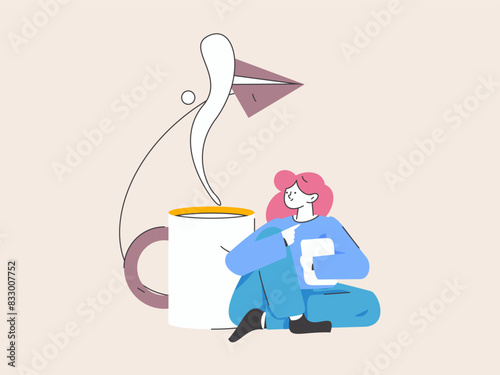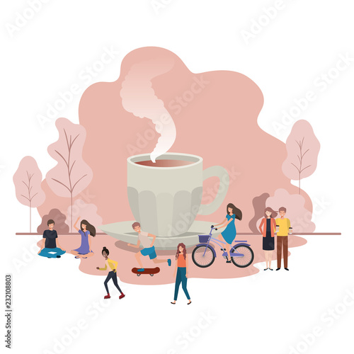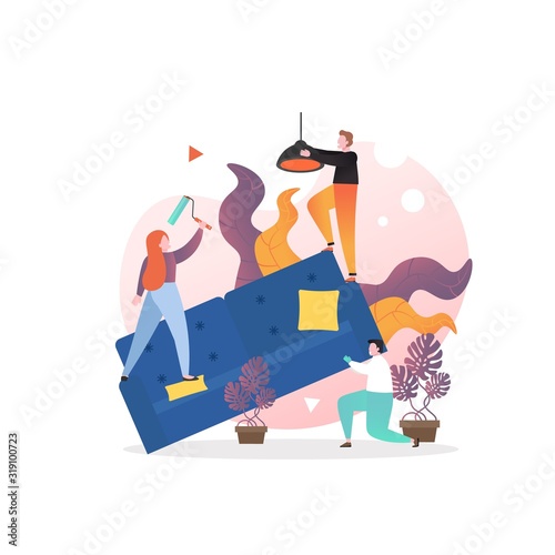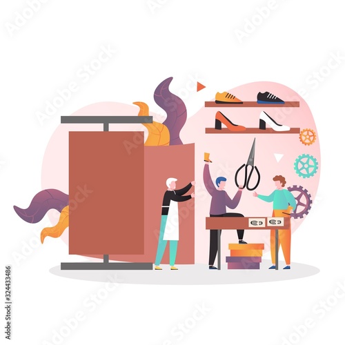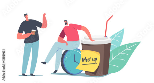 Tiny characters barista team making coffee using big coffee maker, kettle, spoon, vector illustration. Coffee shop, cafe, bar or coffeehouse composition for web banner, website page etc.