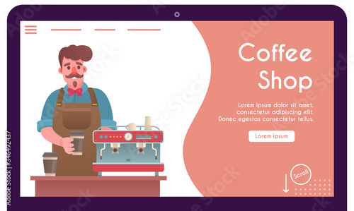 Coffee vector website template, web page and landing page design for website and mobile site development. Coffee shop, coffeehouse composition with barista team grinding coffee beans.