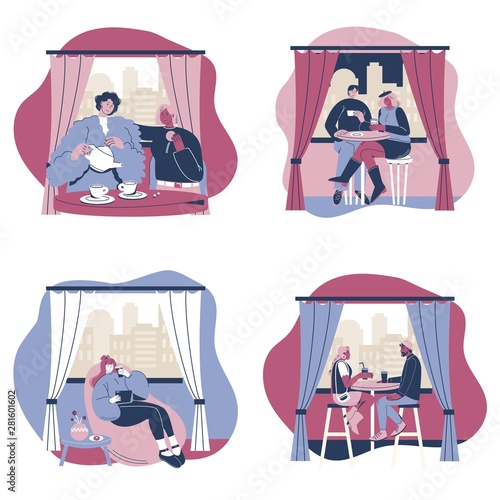 Happy couples drinking coffee in cafe, coffee house, restaurant, vector illustration isolated on white background. Coffee break, dating concept for web banner, website page, poster etc.
