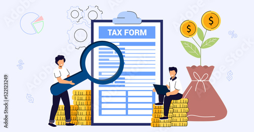 Company budget planning, financial accounting, audit concept vector flat illustration. Clipboard with financial budget plan, calculator, characters analysing diagram with magnifier, sitting on coins.