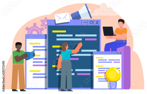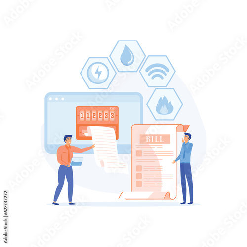 Company budget vector flat style design illustration. Budgeting and business planning process concept with big piggy bank, calculator, tiny people doing financial calculations for web banner, webpage.
