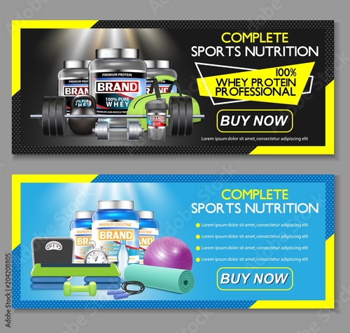 Complete sports nutrition vector horizontal banner set. Sports nutrition supplements whey protein and creatine powder brand advertising web templates.