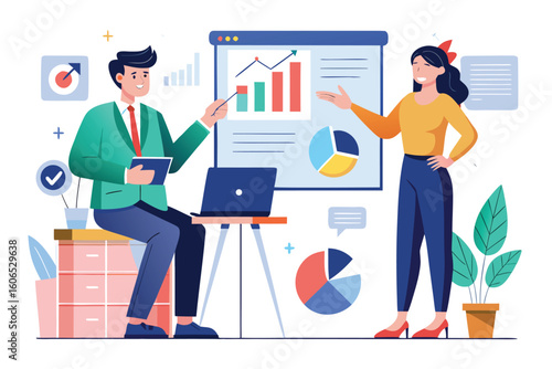 Confectioner female cartoon character in chef hat decorating glazing festive cake, vector flat style design illustration. Male chef baker holding tray with chocolate cake. Pastry shop, confectionery.