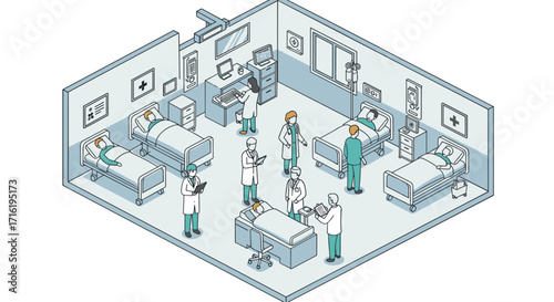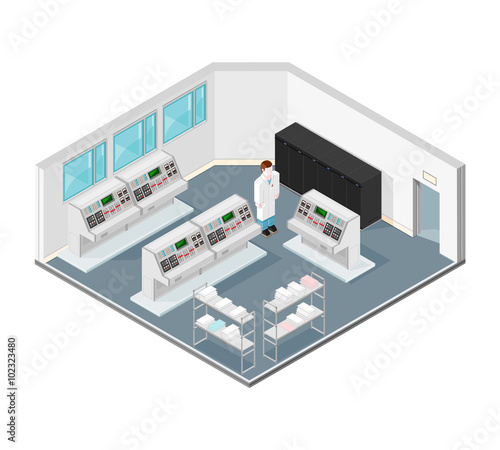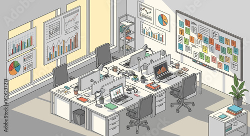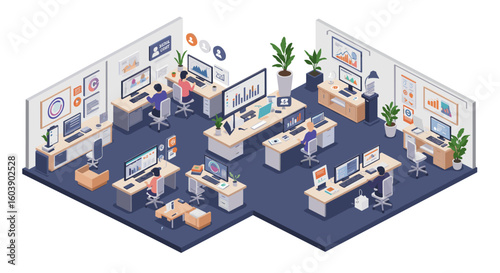 Connected to cloud storage business people work at office, at home and cafe, flat vector isometric illustration. Data storage, cloud computing technology. Remote work. Global outsourcing and teamwork.