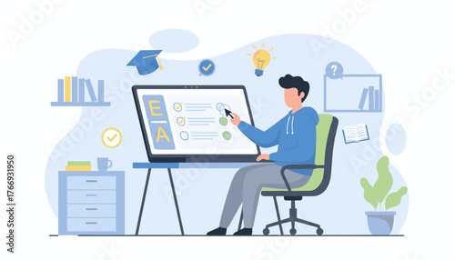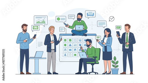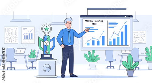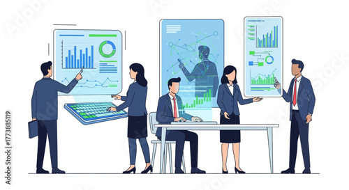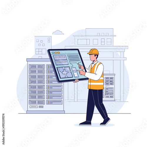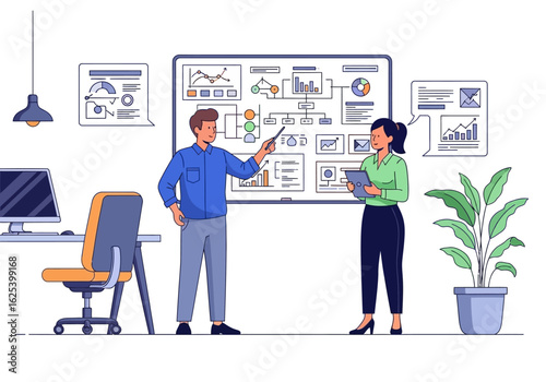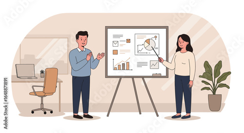 Construction engineer, architect giving presentation of architectural project of house building, flat vector illustration. Building industry. Construction team meeting.