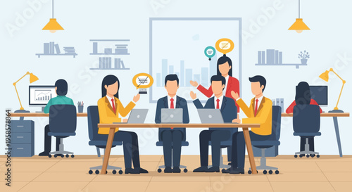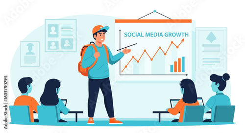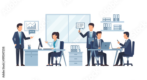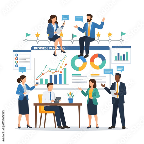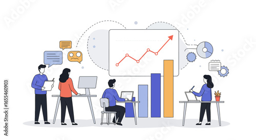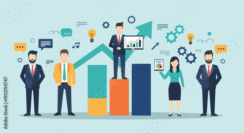 Construction workers standing on raising bar graph, flat vector illustration. Builder, architect, engineer, master, supervisor, foreman. Growth in construction industry. Home builder career path.