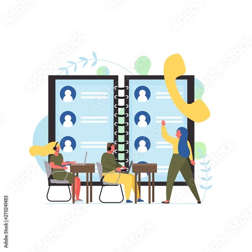 Contact center, vector flat style design illustration. Online customer support services concept with consultants interacting with people via web chat, email communication channels for web banner etc.
