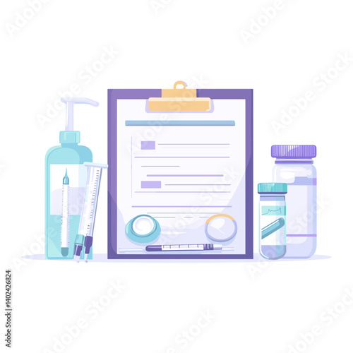 Contact lenses, container, tweezers and solution bottle mock up. Ophthalmology equipment for vision disorder correction. Realistic vector advertising medical poster or banner design