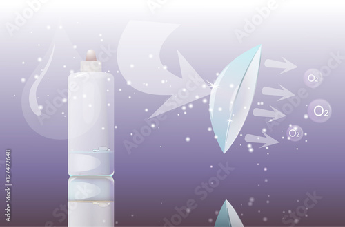 Contact lenses advertising poster. Realistic medical drop bottle and container for storage over water splash bubble design. Ophthalmology, medicine and vision correction concept