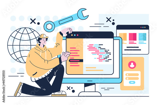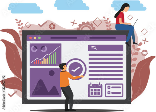 Huge smartphone with envelope, email sign and message bubbles on screen, male and female characters texting messages using laptop and mobile, vector illustration. Contact us concept for website page.