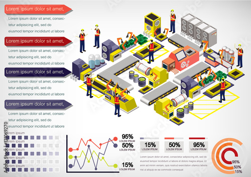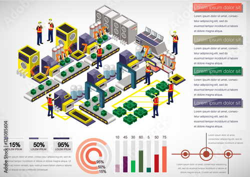 Conveyor vector flat isometric horizontal banner set. Conveyor system, Production control, Packaging line concept design elements for web and printed materials.