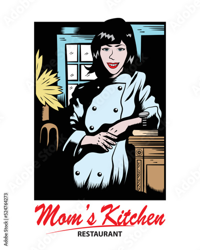 Vector illustration of school cook holding tray with food. Flat style design.