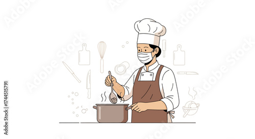 Vector illustration of cook holding kitchen knife and fork ready to cut and serve dish with fire. Cook people concept flat style design element, icon isolated on white background.