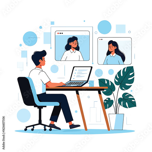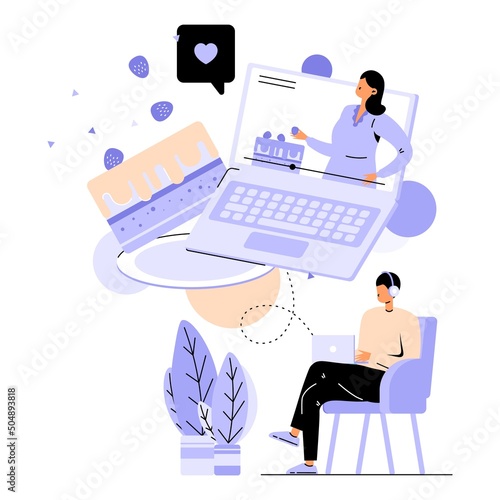Cooking school blog vector. Man watching webinar masterclass lesson at home. New sweet cake recipe presentation. Woman chef baking dessert while streaming online video