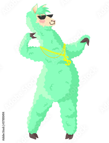 Cool llama alpaca character flat vector icon. Funny lama rapper emoticon isolated on white background. Cute funky animal wearing sunglasses illustration