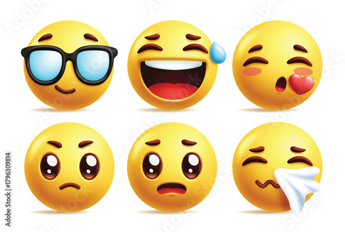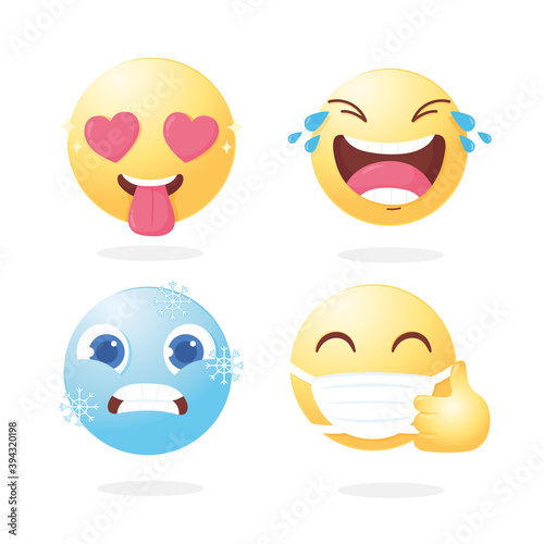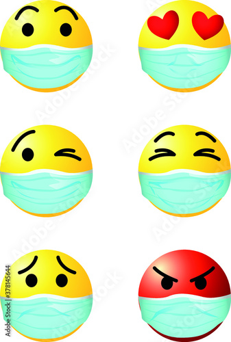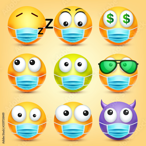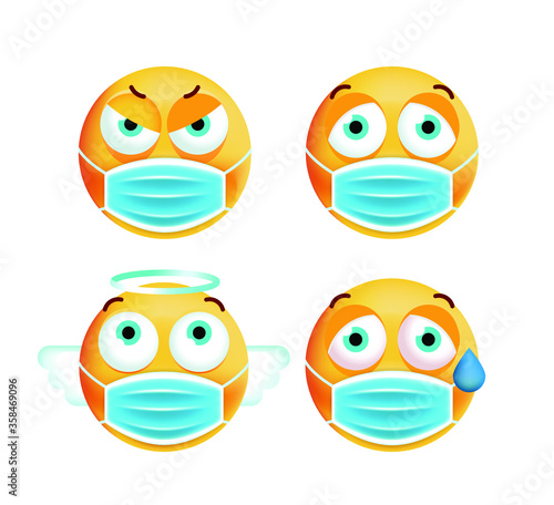 Face mask emoji set, vector isolated illustration. Yellow smile wearing medical mask for social media chat. Cute emoticon characters for electronic comunication. Corona virus disease COVID-19 concept
