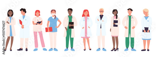 Doctor super hero ready to fight against novel corona virus disease COVID-19, vector flat illustration. Healthcare professionals in medical scrub, white gown, mask hat red cloak. Corona virus pandemic
