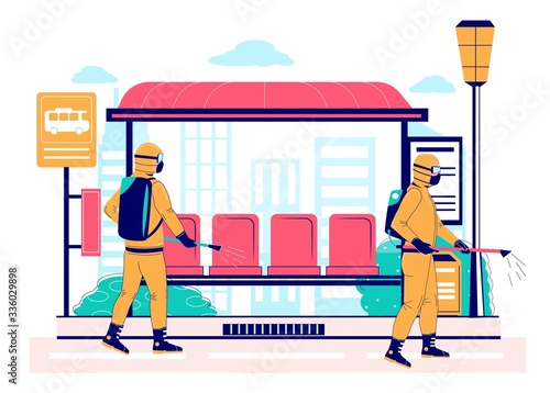 People in full hazmat suits disinfecting city street bus stop surfaces affected by corona virus, vector flat illustration. Corona virus cleaning and disinfection services. Infection spread prevention.