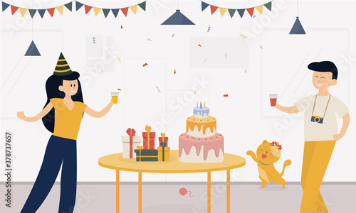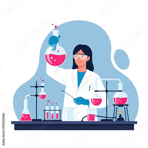Coronavirus research concept vector flat illustration. Group of medical scientists in lab coats, face masks and glasses working in science laboratory developing novel coronavirus vaccine, drugs, tests