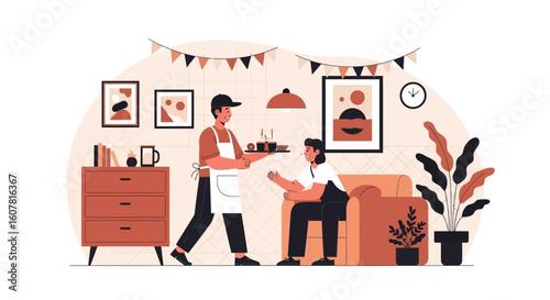 Coronavirus test lab, concept vector illustration. Scientists and doctors use microscope in laboratory. Covid vaccine research. Corona virus spike protein shape.