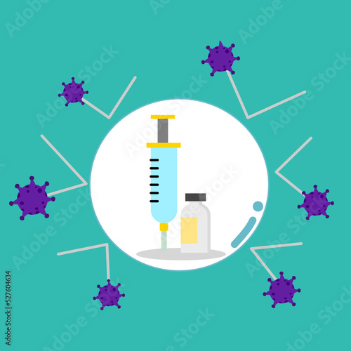 Covid-19 vaccine vials, injection syringe, flying plane, vector illustration in paper art style. Coronavirus vaccination, immunization. Travel after covid vaccine.