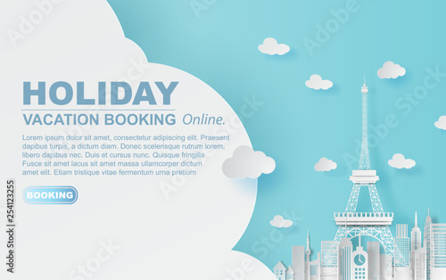 Covid-19 vaccine vials, injection syringe on display podium, world famous landmarks, vector illustration in paper art style. Coronavirus vaccination, immunization. Travel after covid vaccine.
