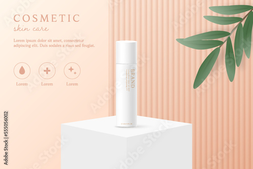 White blank cosmetic bottle on round display podium, paper cut exotic flowers, palm tree leaves, vector illustration. Tropical floral background for beauty product advertising.
