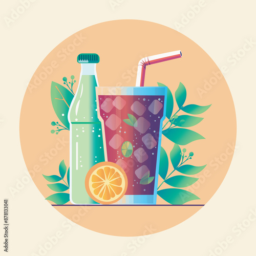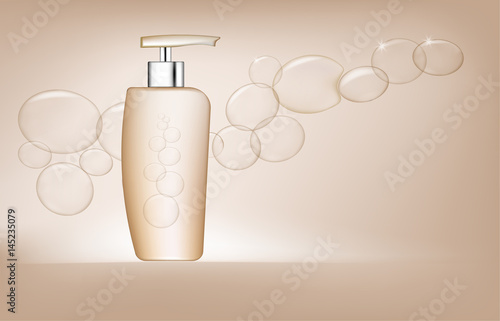 White blank cosmetic bottle on round display podium, paper cut exotic flowers, palm tree leaves, vector illustration. Tropical floral background for beauty product advertising.