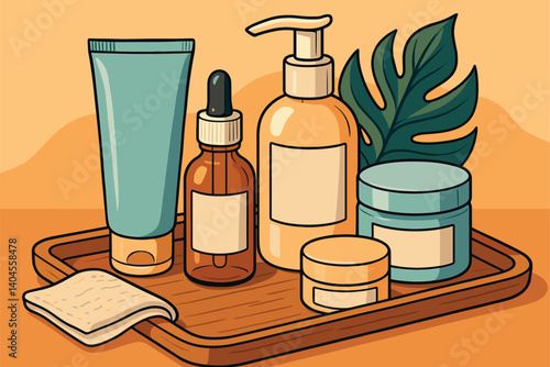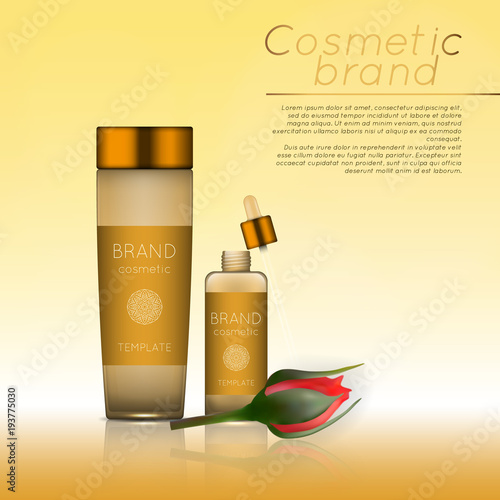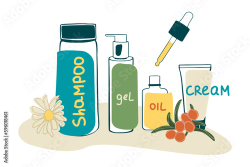 Cosmetic products for hair and skin care vector design. Skincare bottle, jar, tube, shampoo and hair spray. Beauty gift box for woman illustration. Cosmetics sale and discount advertisement template