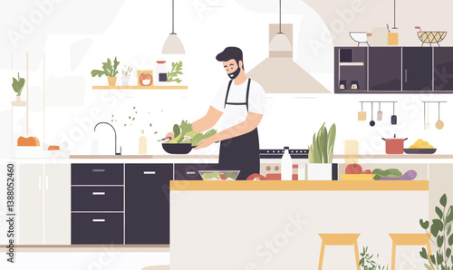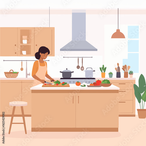 Cosmetics store. Female shop assistant standing at counter, flat vector illustration. Shelves with health and beauty products. Makeup, hair, face and body skincare cosmetics.