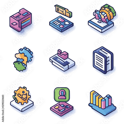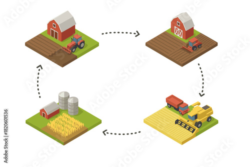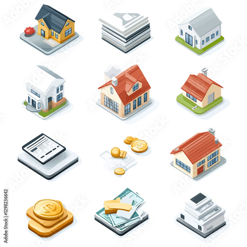 Cottage construction steps. Vector isometric illustration of site grading, plumbing and drainage, foundation setting, roofing, wrap installation, framing, cladding, windows and doors and ready house.