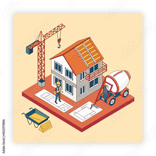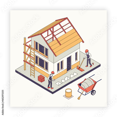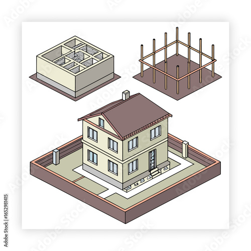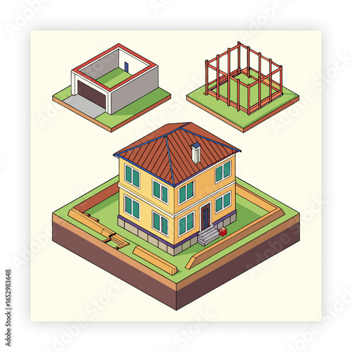Cottage construction vector flat isometric poster, banner set. Foundation, Framing, Roofing, Windows and doors design elements.