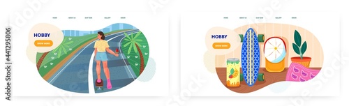 Cotton candy cart landing page design, website banner template set, flat vector illustration. Popcorn, ice cream, frozen juice. Food truck business.