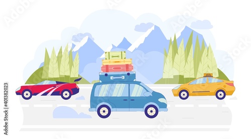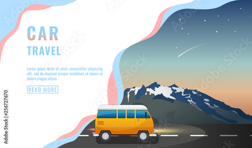 Couple in a car going to road trip. Travel planning vector concept illustration. Woman dreaming about vacation and plan her holiday route. Web site design template for summer travel.