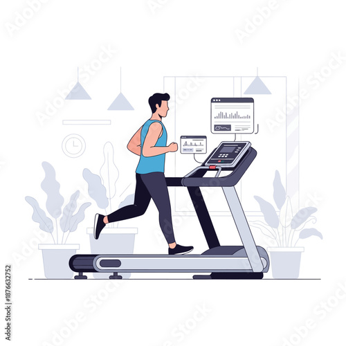 Couple running on treadmills, flat vector illustration. Fitness gym treadmill workout, healthy lifestyle, sport equipment.