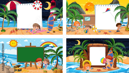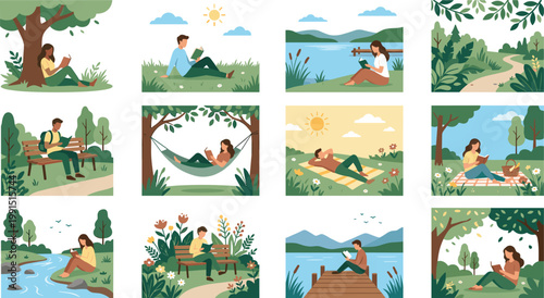 Couple sitting next to camp tent and watching starry night. Summer camp vacation vector posters set. Mountain and forest landscape with tents. Camping equipment. Adventure, nature, campfire.