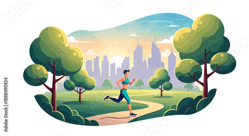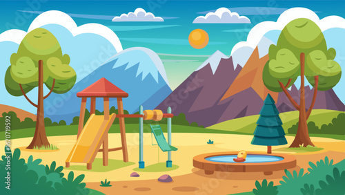 Couple trekking in mountains and crossing river. Travel adventure and hiking concept vector poster. Man and woman with backpack in outdoor nature landcape.