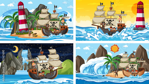 Couple trekking in mountains. Travel adventure and hiking concept vector posters set. People climb mountain. Man and woman with backpack in outdoor nature landcape. Trekking boot closeup view.