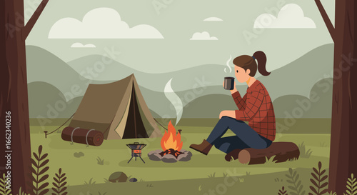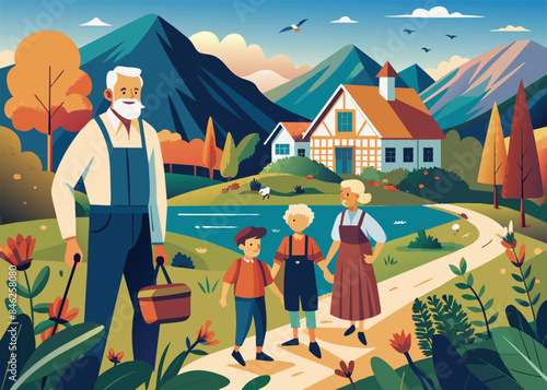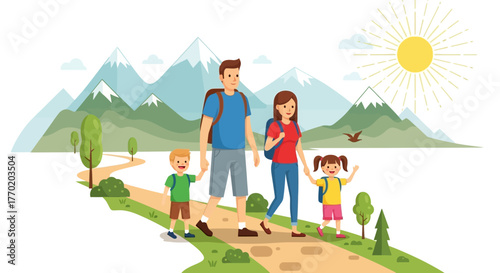 Couple with guide trekking in mountains. Travel adventure and hiking concept vector poster. People climb mountain. Man and woman with backpack in outdoor nature landcape.