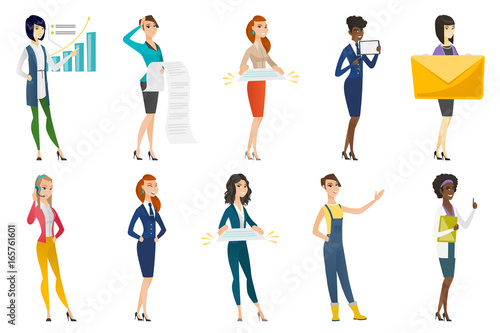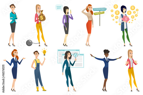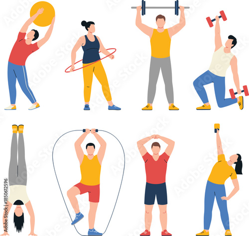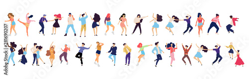 Couples using mobile phones. Vector illustration isolated on white background. Young pairs talking, listening to music, taking selfie, emailing, texting messages on the move.