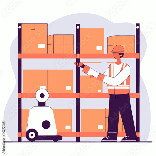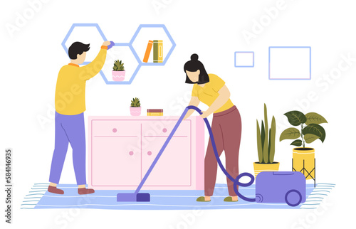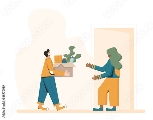Delivery man, courier in face mask delivering food products to home door, giving grocery bag to customer female, flat vector illustration. Home delivery services during corona virus covid-19 pandemic.