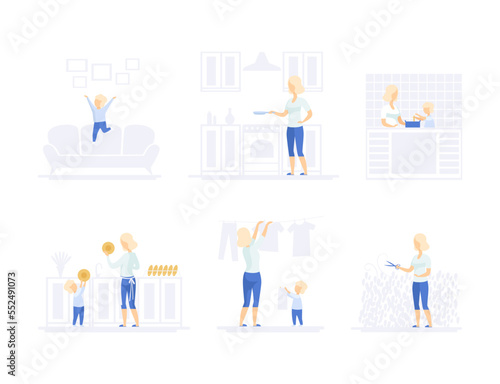 Covid-19 scene set, flat vector isolated illustration. Coronavirus vaccination and its side effects, testing for COVID-19, temperature scanning, digital travel vaccine passport or certificate.
