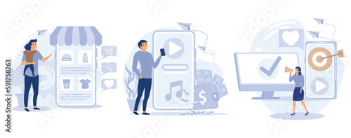 Covid-19 scene set, flat vector isolated illustration. Coronavirus vaccination and its side effects, testing for COVID-19, temperature scanning, digital travel vaccine passport or certificate.