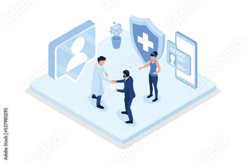Doctor turning coronavirus counter arrow from high to low level. Covid-19 vaccine injection, flat vector isometric illustration. Corona virus vaccination and immunization. Infected cases reduction.