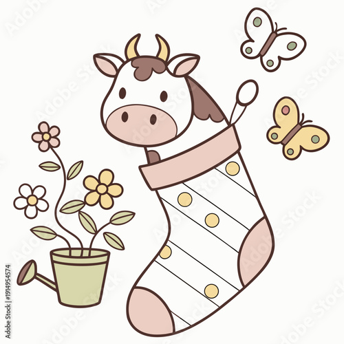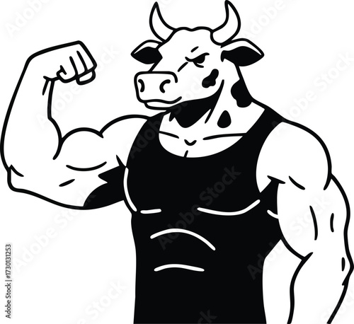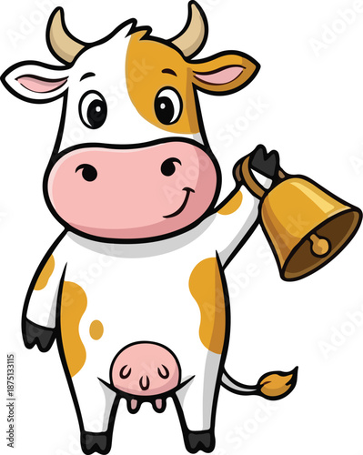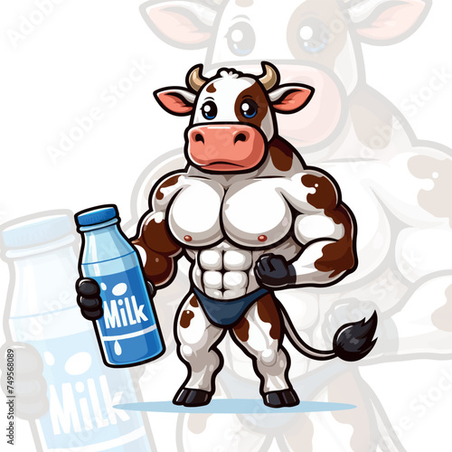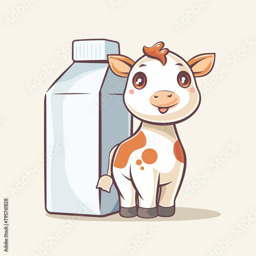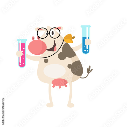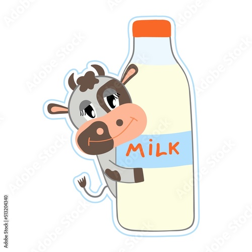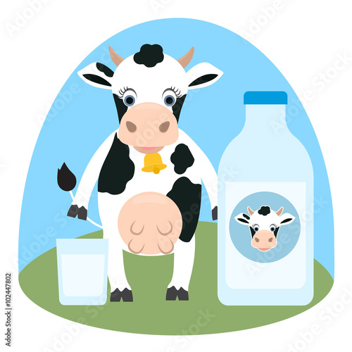 Cow with milk can and bottle vector. Funny farm animal cartoon character holding glassware with fresh dairy product standing near metal canister dairy isolated on white background